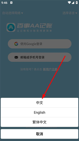 4、初始界面點擊選擇語言,會彈出含中文English繁體中文的選項列表,選擇對應語言后可點擊取消關閉列表,完成語言設置操作。