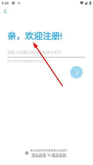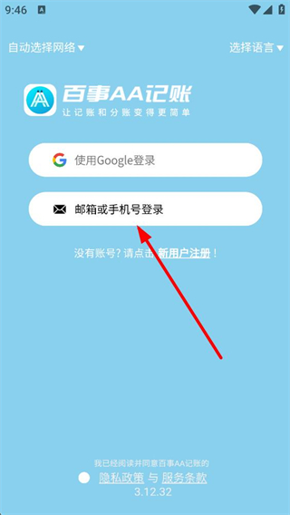 1、進入界面看到百事AA記賬及讓記賬和分賬變得更簡單的提示,有使用Google登錄和郵箱或手機號登錄選項,下方有新用戶注冊入口,底部需勾選隱私政策與服務條款。