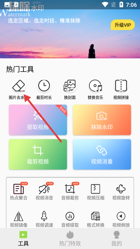 1、APP的工具界面圖片去水印是熱門功能之一,點擊該選項可對圖片中的水印進行處理,配合裁剪時長、換封面等工具,滿足視頻與圖片編輯需求。