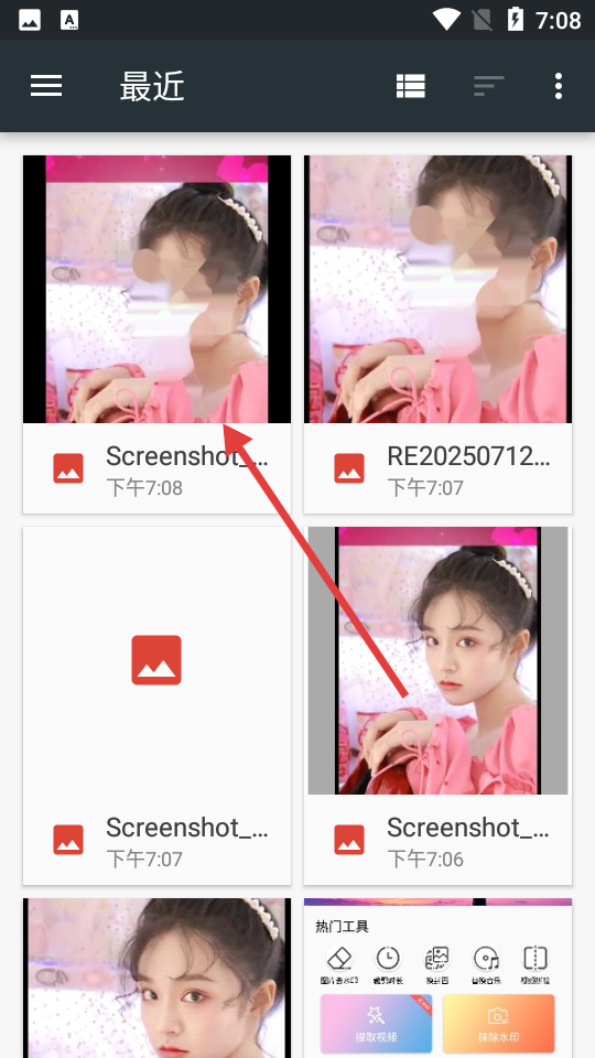 2、接著進入最近頁面,用于集中展示近期操作過或關聯的圖片和視頻文件,方便用戶快速查找、二次編輯,點擊對應文件可進入編輯流程如去水印、裁剪等。