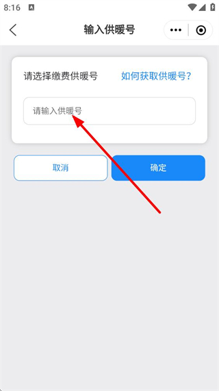 4、進入輸入供暖號頁面后,找到請輸入供暖號的輸入框,框中填寫對應的供暖號,隨后可點擊確定按鈕推進流程。