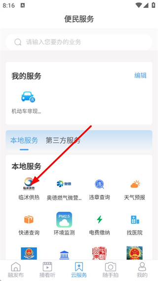 2、進入云服務頁面后,本地服務板塊里找到臨沭供熱選項,點擊該選項,進入到繳納供暖費的專屬頁面。