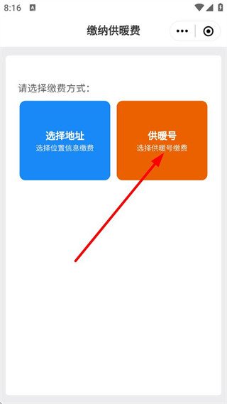 3、進入繳納供暖費頁面后,看到呈現的兩種繳費方式,選擇其中的供暖號選項,點擊它進入到輸入供暖號的頁面。