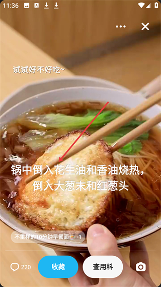 2、菜譜制作視頻頁呈現蔥油手撕雞步驟,同步顯示操作文字指引,底部設收藏、查用料按鈕,直觀演示烹飪過程,輔助用戶精準復刻美味。