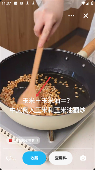 3、板塊教用戶制作過年自制小零食,中火倒入玉米和玉米油翻炒,食材簡單易獲取,制作過程清晰,適合家庭自制年貨。