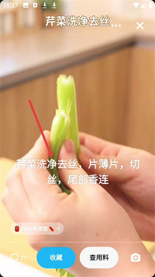 4、講解年夜飯芹菜處理方法,芹菜洗凈去絲、片薄片、切絲,尾部相連,為年夜飯食材處理提供實用技巧,讓菜肴更精致。