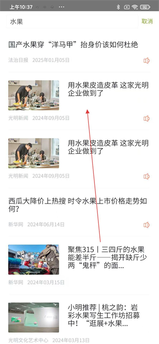 2、登錄后在搜索框輸入水果關鍵詞,進入相關資訊列表頁面,瀏覽水果相關的各類新聞內容。