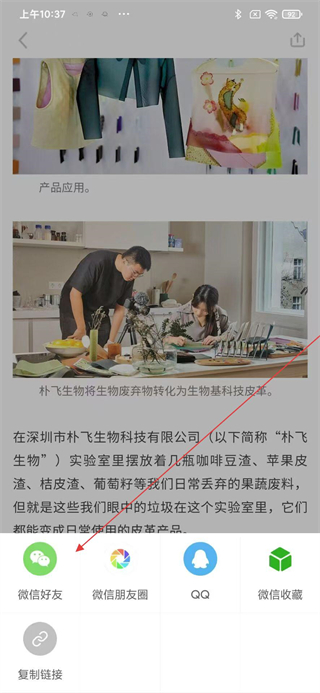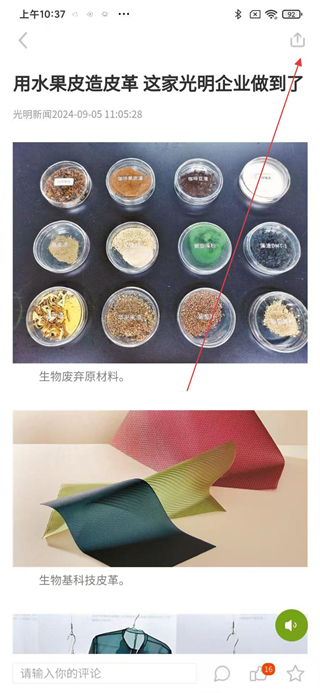 3、在資訊列表頁選擇目標資訊如用水果皮造皮革的內容,點擊進入該資訊的詳情頁面查看信息,點擊上方的分享按鈕。