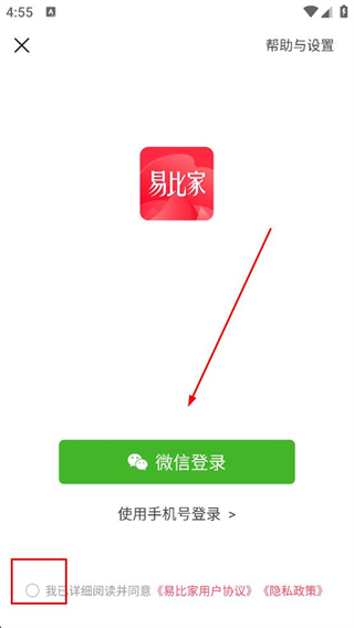 1、打開易比家APP,進入登錄頁面,勾選已詳細閱讀并同意用戶協議和隱私政策,點擊微信登錄,完成賬號登錄。