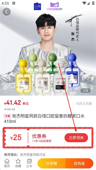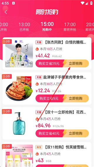 3、在限時搶購頁面選擇感興趣的商品,如張杰明星同款白惜抗糖漱口水,點擊立即搶購,進入商品詳情頁面。