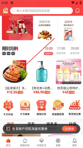2、登錄后進入首頁可看到熱榜專場、品牌單等板塊,還有限時搶購區域,點擊限時搶購,進入限時搶購頁面。