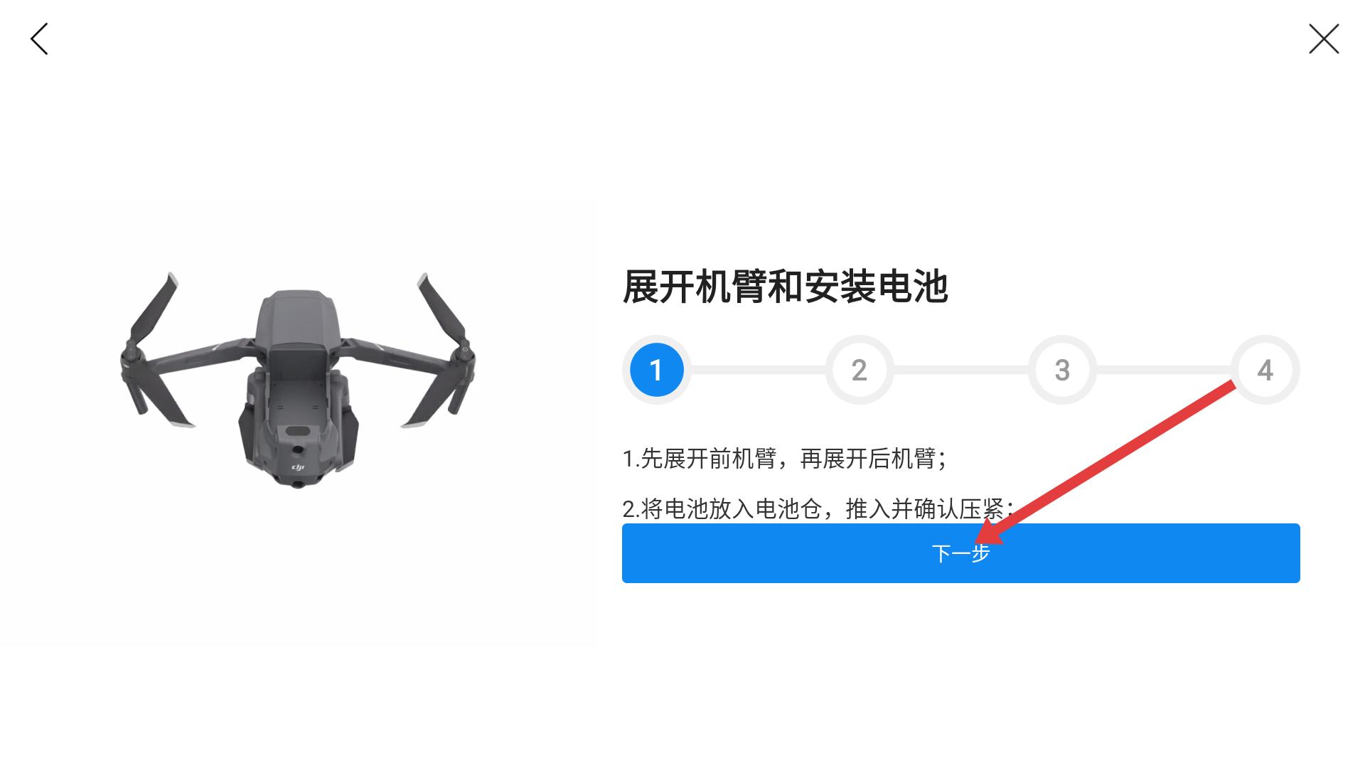 3、展開機臂和安裝電池界面,按照提示先展開前機臂再展開后機臂,將電池放入電池倉并確認壓緊后,點擊下一步繼續操作。