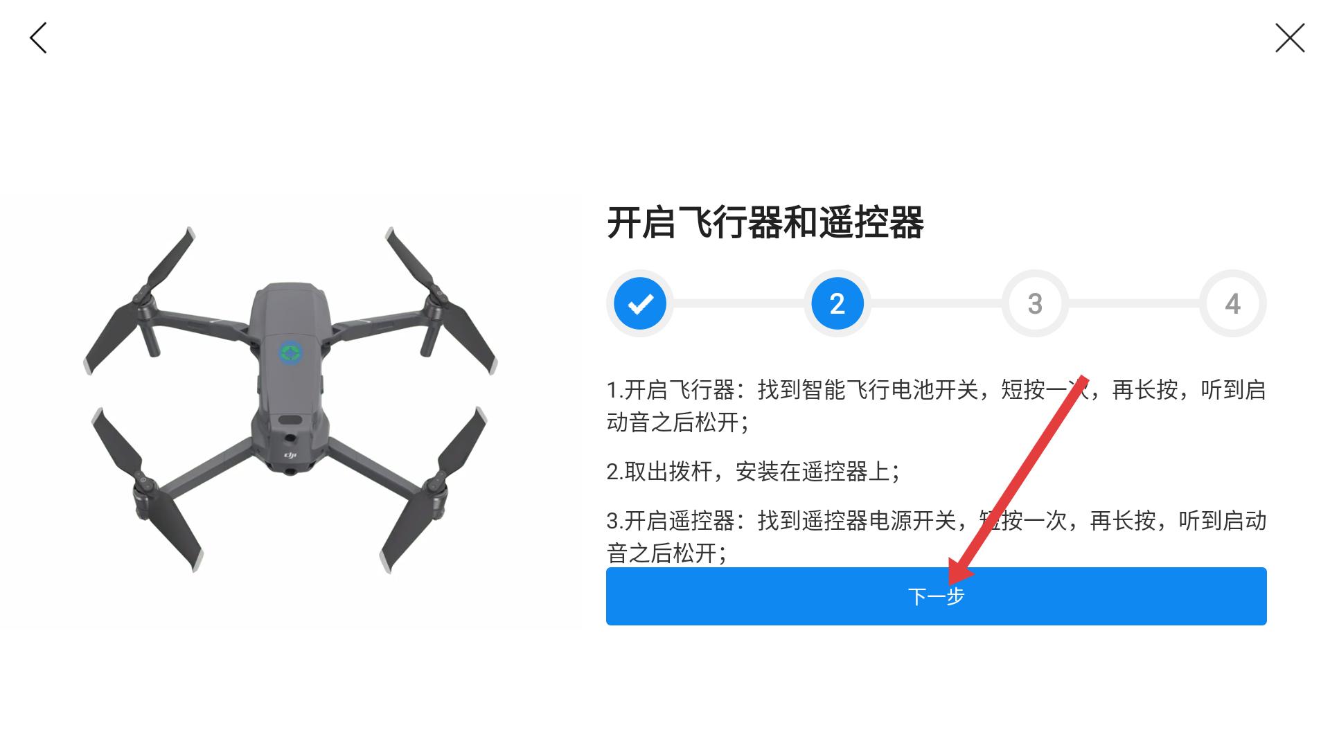 4、開啟飛行器和遙控器界面,按照步驟開啟飛行器和遙控器后,點擊下一步完成設備啟動流程。