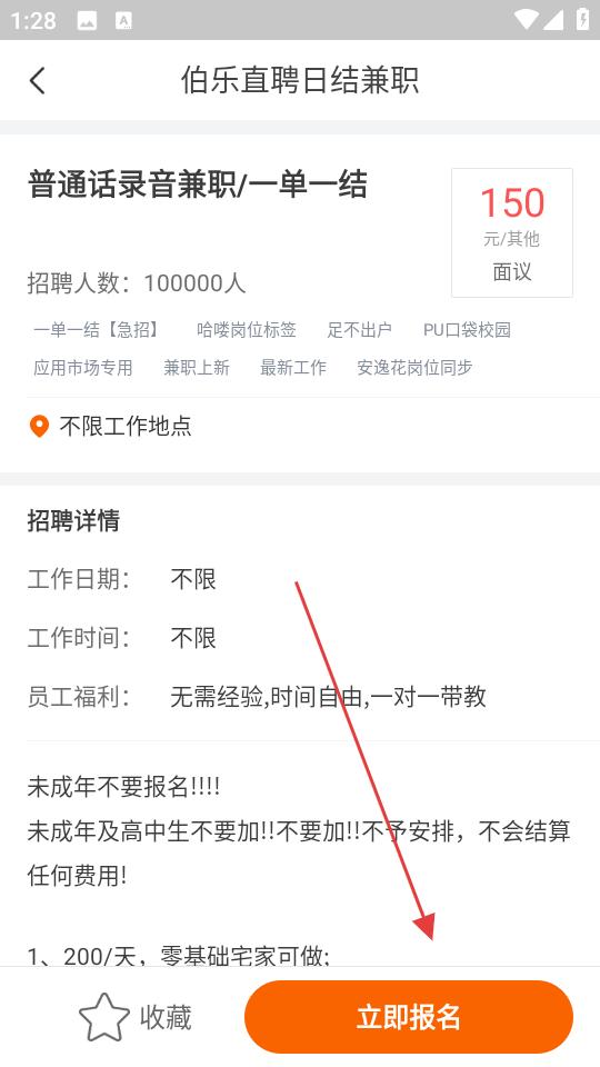 3、在兼職詳情界面,仔細瀏覽招聘人數、工作日期、時間安排、員工福利等信息,確認自身符合報名條件后,點擊頁面底部立即報名,提交報名信息參與兼職。
