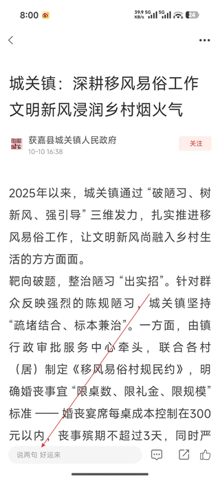 3、在文章詳情頁閱讀內容了解城關鎮推進移風易俗的具體舉措,找到頁面下方的評論輸入框,準備輸入想要發表的內容。