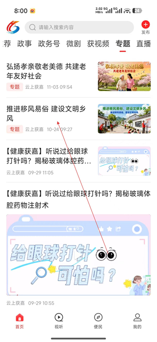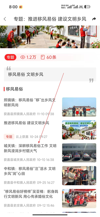 1、打開云上獲嘉APP,進入首頁后選擇專題板塊,在展示的專題列表中找到推進移風易俗建設文明鄉風專題,點擊進入該專題頁面。