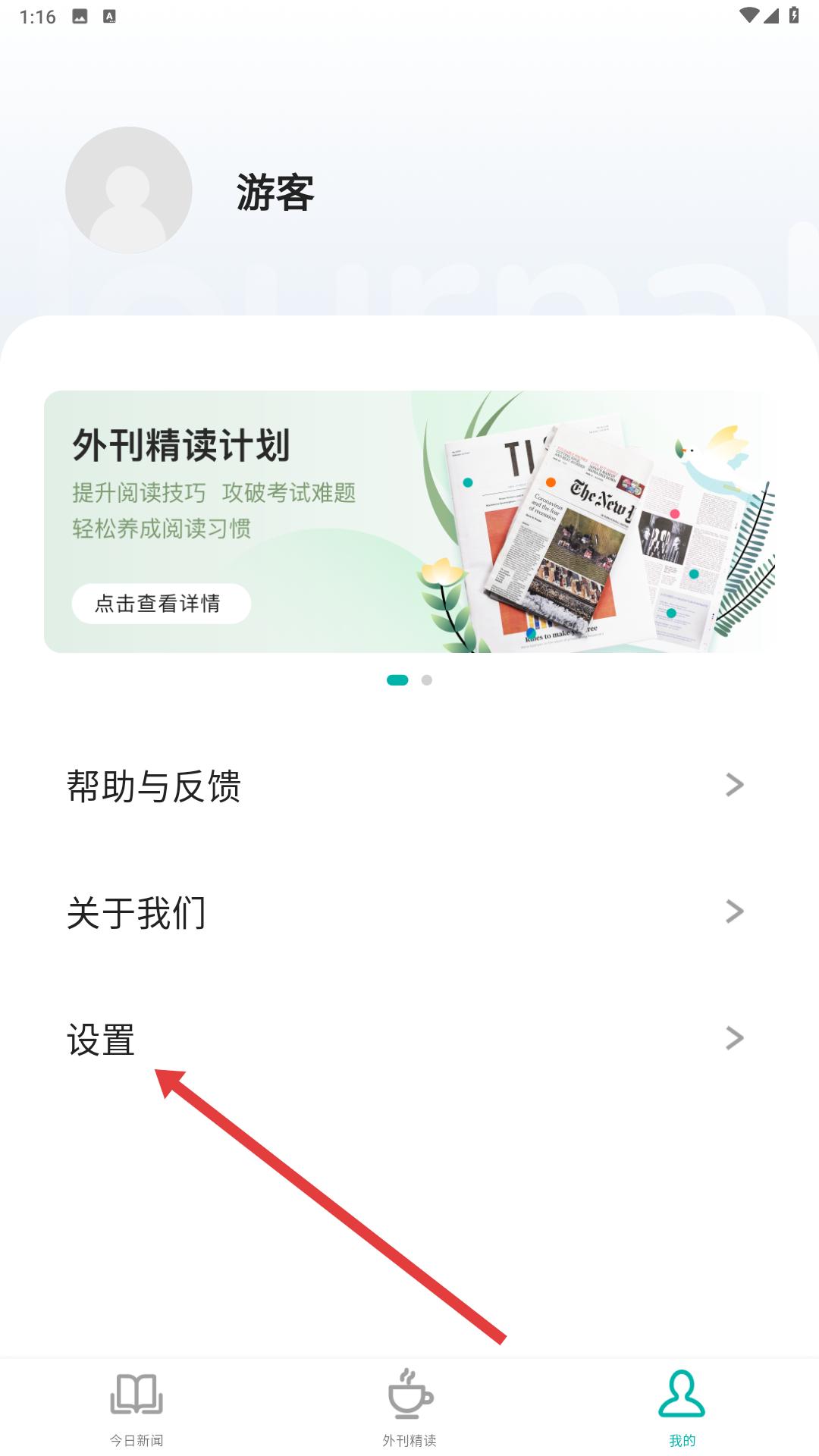 4、進入我的板塊,游客身份下可查看外刊精讀計劃詳情,還有幫助與反饋、關于我們、設置等入口,管理應用使用設置。