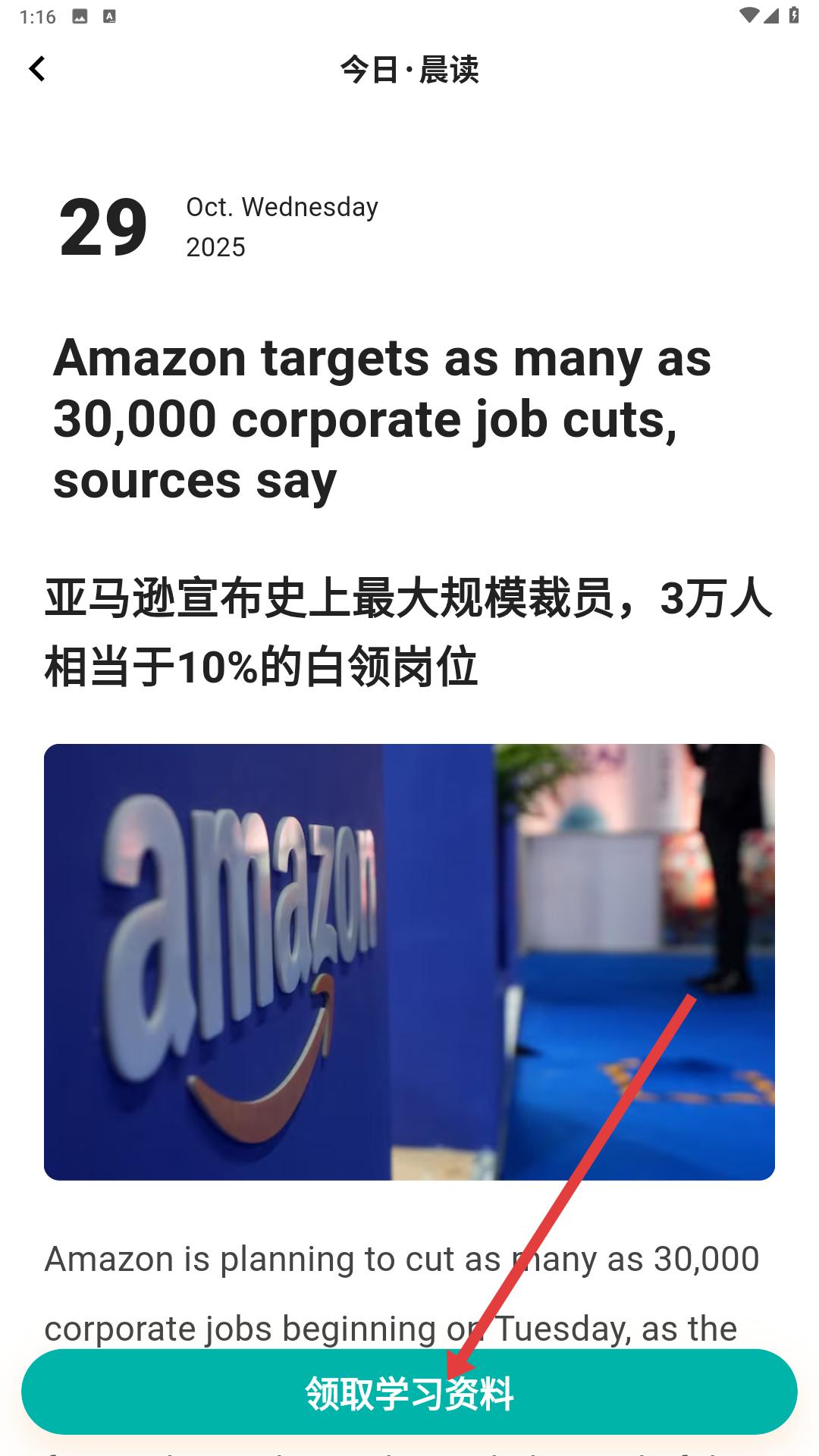 2、點擊今日晨讀新聞,進入詳情頁,可查看中英雙語新聞內容,還能領取學習資料,通過新聞閱讀提升英語閱讀能力。