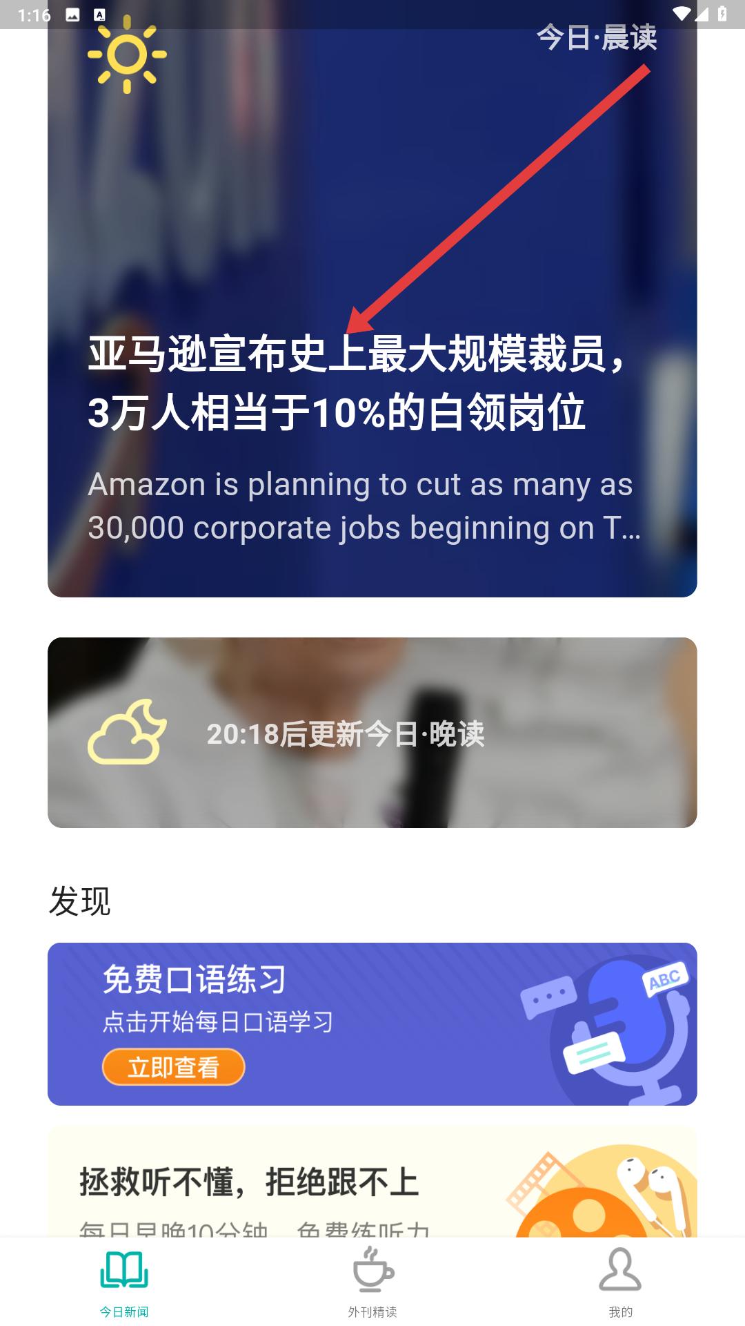 1、進入應用今日新聞板塊,可見今日晨讀內容,如亞馬遜裁員相關新聞,還有發現板塊的免費口語練習入口,可開啟英語學習之旅。