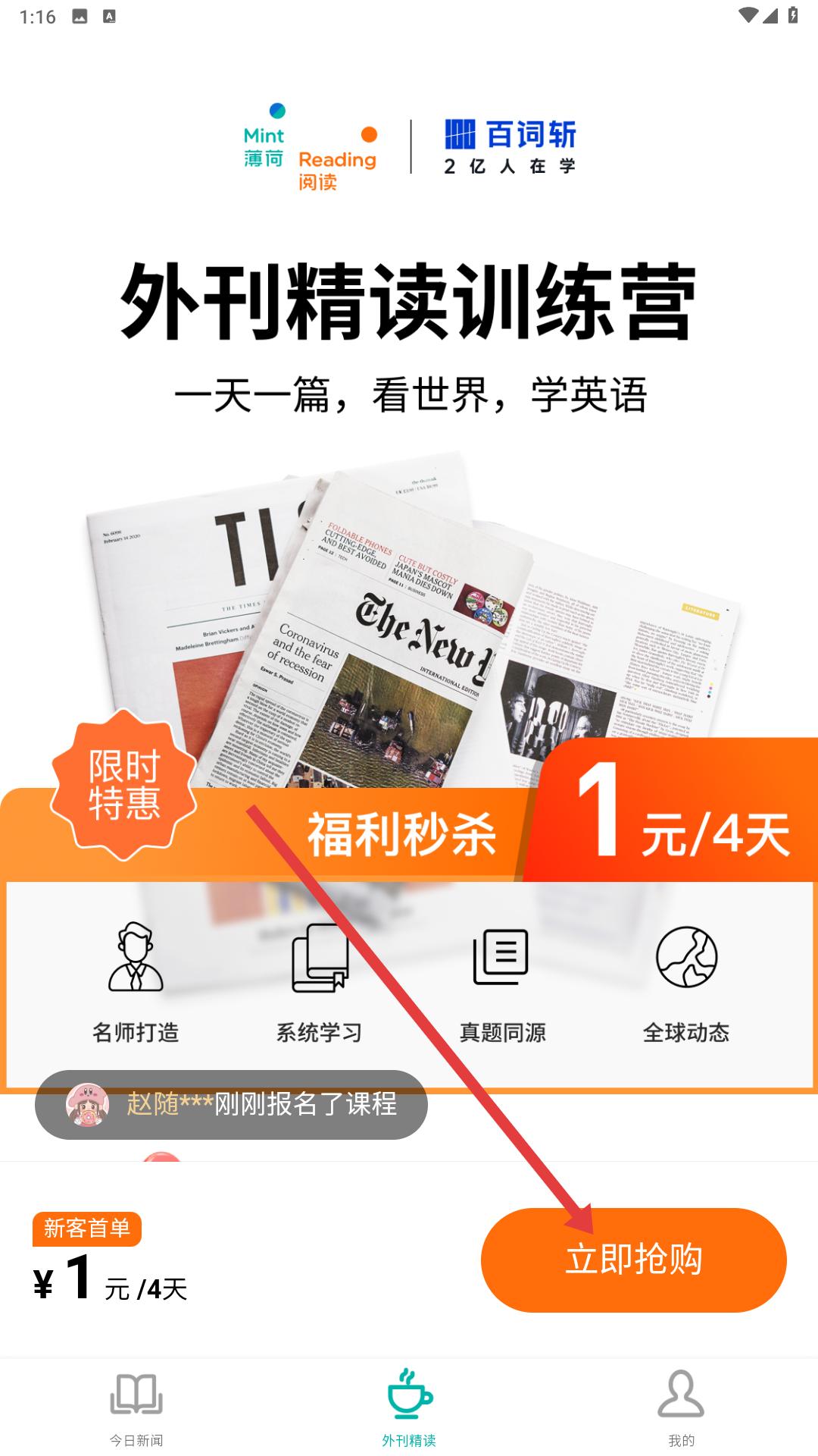 3、切換到外刊精讀板塊,可見外刊精讀訓練營的限時特惠活動,1元可享4天課程,包含名師打造、系統學習等特色,點擊立即搶購參與課程。