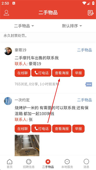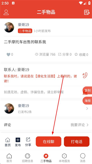 4、點擊進入其詳情頁面,可點擊在線聊按鈕與發布者溝通,也能選擇打電話直接聯系,還能進行評論或分享該物品信息給其他用戶。