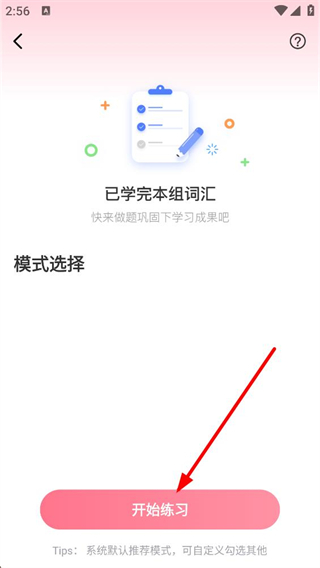 4、完成本組詞匯學習后會顯示已學完本組詞匯提示,點擊開始練習按鈕,即可通過做題鞏固所學內容,系統默認推薦練習模式也可自定義選擇。