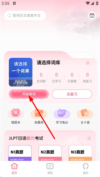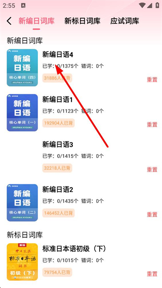 2、詞庫選擇頁面可看到新編日詞庫新標日詞庫等分類,選擇對應詞庫,查看該詞庫的已學數量錯詞數,選定后即可進入該詞庫的背詞環節。