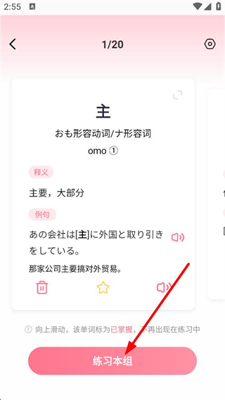 3、進入單詞學習界面會展示單詞的詞性讀音釋義及例句,向上滑動可將單詞標為已掌握,點擊練習本組按鈕,即可進入本組詞匯的練習環節。