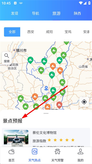 4、旅游板塊,可查看陜西各地景點分布地圖,還有景點預報板塊,呈現蔡倫文化博物館等景點的旅游指數和天氣情況,方便規劃旅游行程。