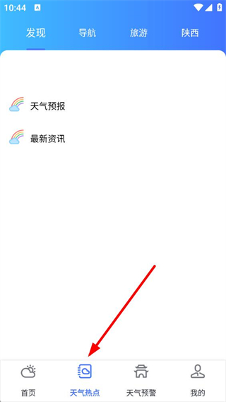 2、點擊天氣熱點可進入相關頁面,該頁面有天氣預報、最新資訊等板塊,還有發現、導航等分類標簽,可了解天氣相關熱點信息。