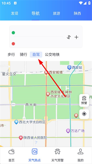 3、導航板塊,可選擇步行、騎行、自駕、公交地鐵等出行方式,查看西安地區的地圖導航信息,助力規劃出行路線。