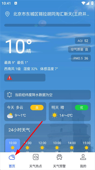 1、進入首頁可查看北京市東城區的天氣信息,包括溫度、天氣狀況、AQI等,還有今天和明天的天氣預報及24小時天氣變化,能及時了解天氣動態。