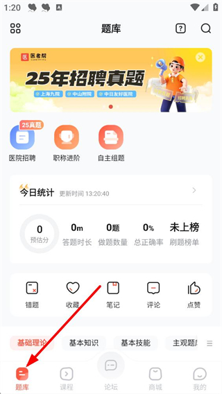 1、進入題庫板塊,可查看醫院招聘、職稱進階、自主組題等真題資源,了解今日統計的答題時長、做題數量等,使用錯題、收藏、筆記等功能。