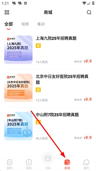 4、進入商城板塊,可查看全部、視頻、集訓類商品,購買上海九院、北京中日友好醫院等招聘真題,獲取考試資源。