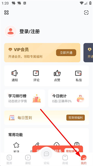 2、進入我的板塊,可進行登錄、注冊,開通VIP會員領取專屬福利,查看通知、評論、點贊和私信,了解學習排行榜和今日統計,進行每日簽到領取福利,使用常用功能。