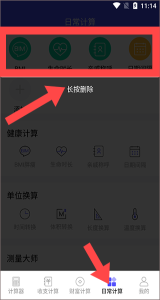 3、諸葛計算器手機版APP日常計算板塊,有BMI、生命時長等健康計算選項,還提供單位換算等多種功能。