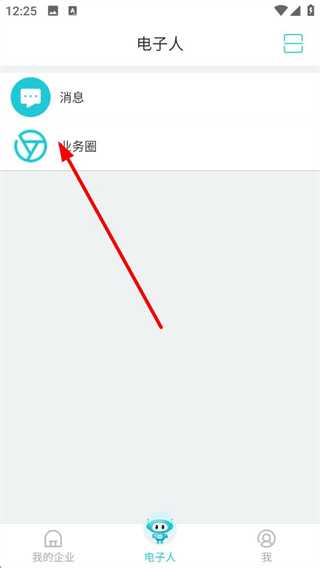 2、進入電子人頁面后,可切換消息業務圈等功能板塊,點擊業務圈選項,即可進入業務圈界面,使用云企業相關功能。