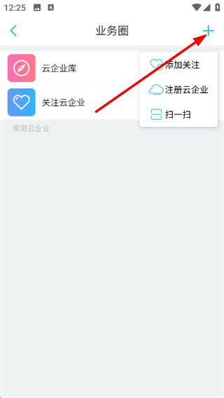 3、進入業務圈界面后,可查看云企業庫關注云企業等功能,點擊右上角加號,可選擇添加關注注冊云企業或掃一掃等操作。