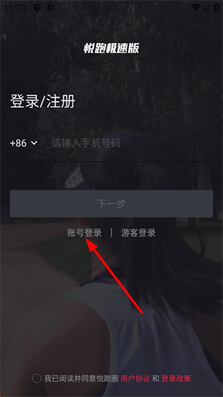 1、進入悅跑極速版的登錄、注冊頁面,可選擇輸入手機號碼進行注冊登錄,也能點擊賬號登錄或游客登錄,切換不同的登錄方式。