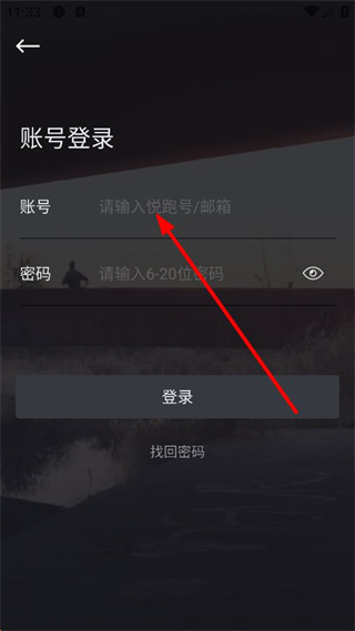 2、賬號登錄頁面,需輸入悅跑號、郵箱及對應的密碼,完成信息填寫后點擊登錄按鈕,即可登錄賬號使用應用功能,忘記密碼可點擊對應選項找回。