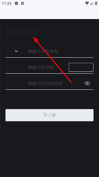 4、選擇手機號找回密碼后,進入手機找回密碼頁面,需輸入手機號碼、獲取并填寫驗證碼,再設置新密碼,完成后點擊下一步即可重置密碼。