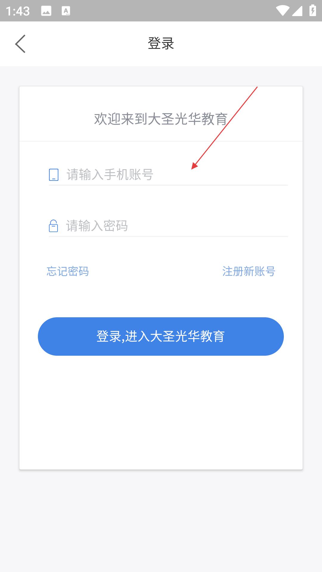 2、登錄頁面需輸入手機賬號、密碼,有忘記密碼、注冊新賬號入口,點擊登錄,進入大圣光華教育按鈕完成登錄。