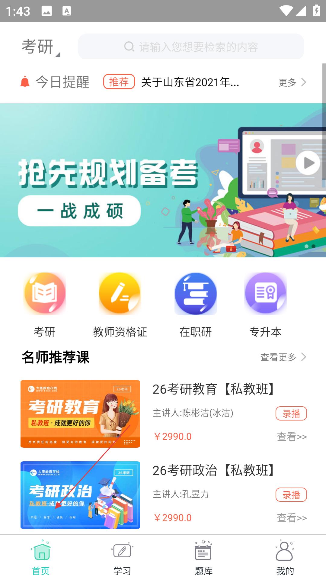 3、首頁聚焦考研,有今日提醒、推薦內容,展示備考規劃,設考研、教師資格證等功能入口,還有名師推薦課,底部是首頁、學習等導航欄。