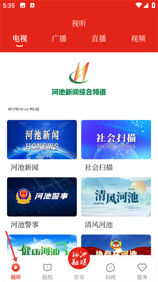 1、進入視聽頁面的電視分類,可看到河池新聞綜合頻道的展示,包含河池新聞社會掃描河池警事等欄目選項,點擊對應欄目即可獲取相關資訊內容。