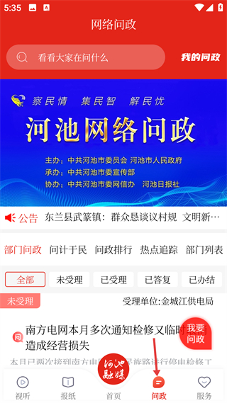 3、進入問政頁面,可參與網絡問政,頁面設有部門問政問計于民等板塊,還能查看問政事項的處理狀態,反饋或了解相關問題的進展。