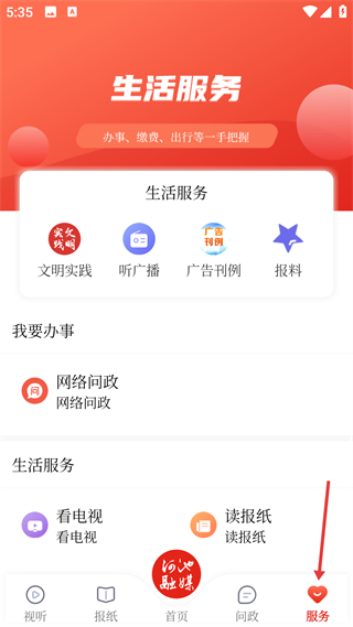 4、進入服務頁面,有文明實踐聽廣播等生活服務功能選項,還設有我要辦事板塊,可通過這些功能獲取服務或辦理相關事項內容。