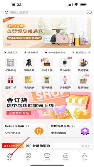 1、首頁雙11大促母嬰爆品優惠,功能入口含優勢奶粉、美妝護膚等,還有店中店開店功能,可選各類商品。