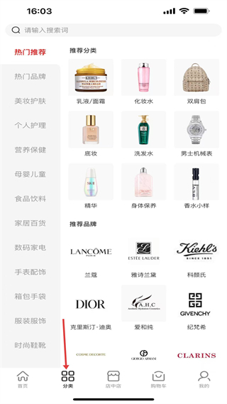 2、分類頁有美妝護膚、母嬰兒童等分類,推薦蘭蔻、雅詩蘭黛等品牌,可按分類找心儀商品。