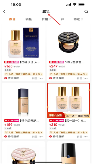 3、底妝分類頁展示雅詩蘭黛粉底液、YSL氣墊等,雙11美妝周優惠,多商品香港直郵,銷量超1w。