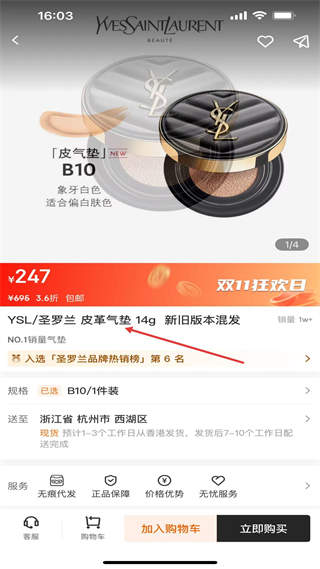4、YSL皮革氣墊詳情頁,雙11價247元3.6折,B10色號適合偏白膚色,香港發貨,可加入購物車或立即購買。
